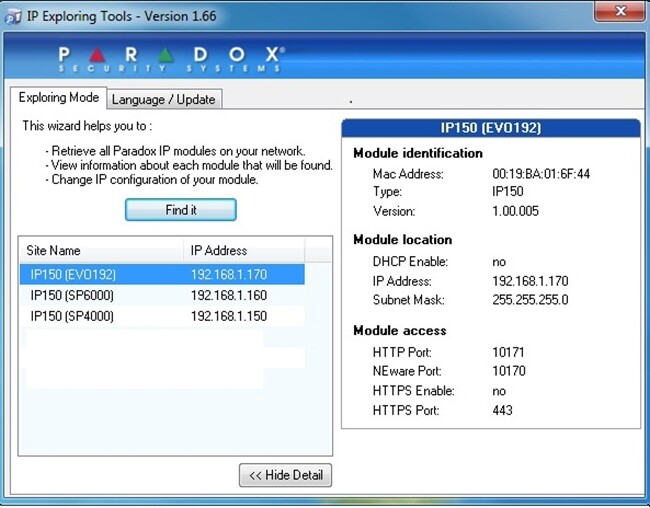 Эта программа позволяет Вам найти модули Paradox в сети, настроить их IP
